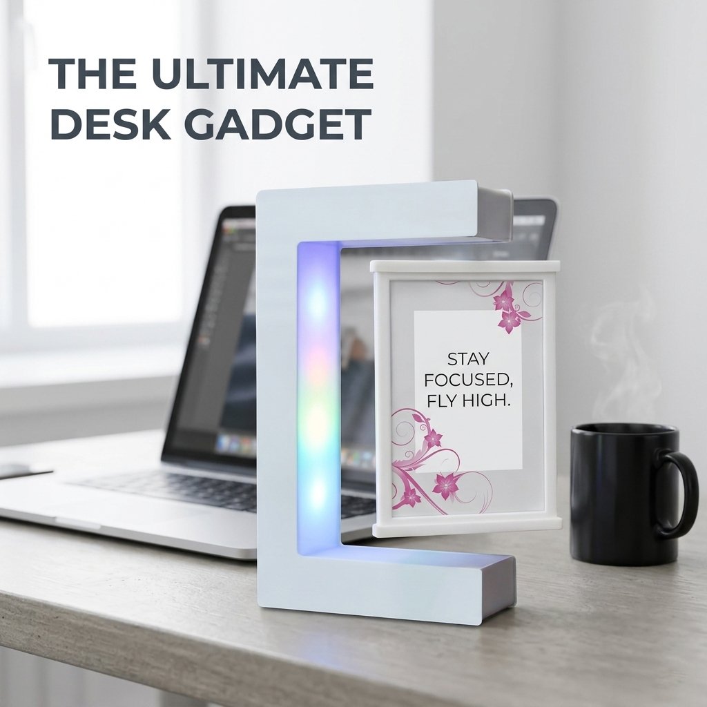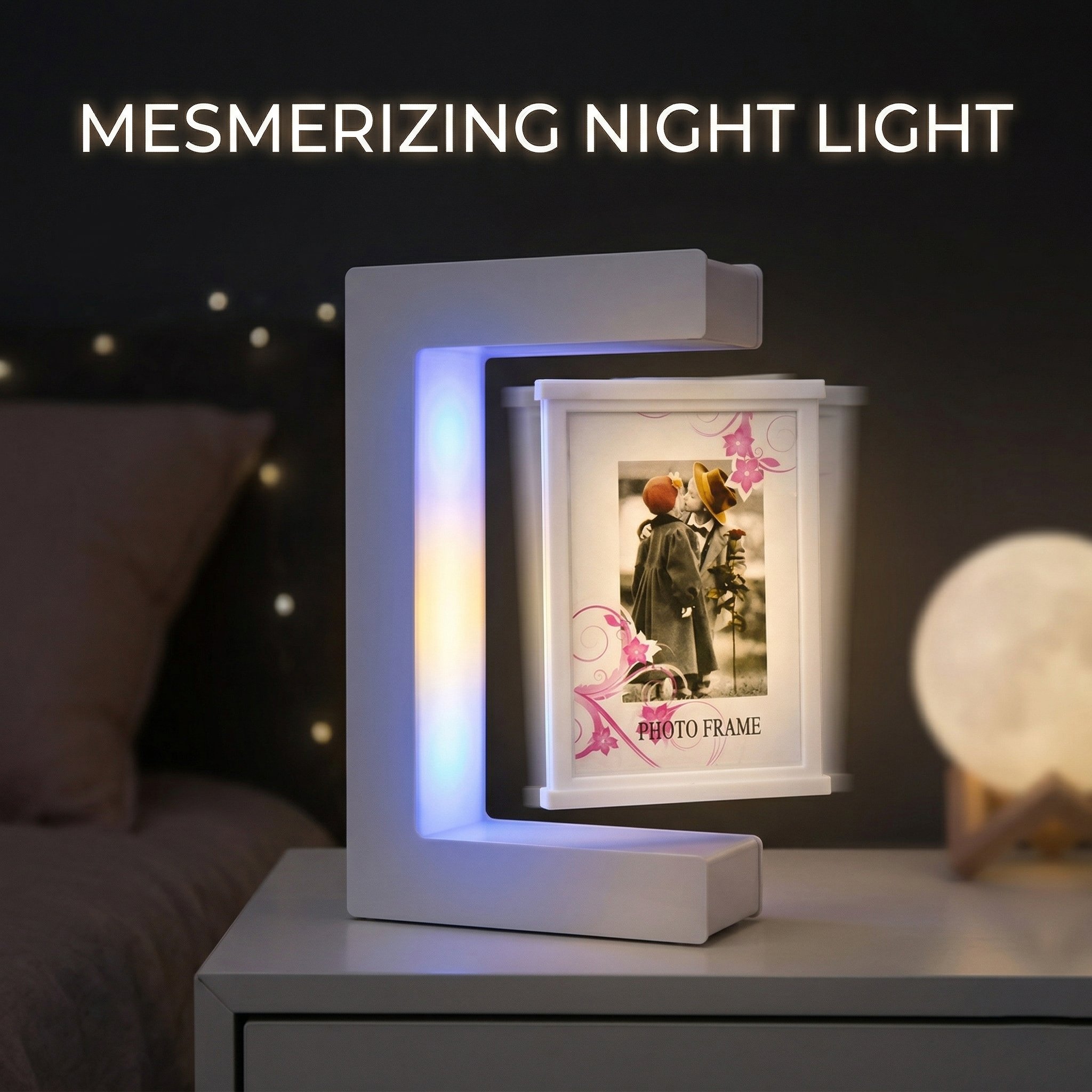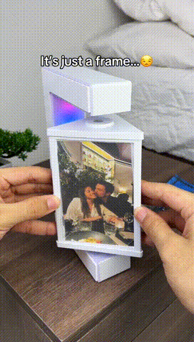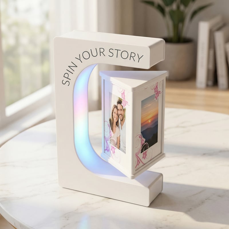 When the sun goes down, the magic continues. The C-shape base features vibrant, built-in LED lights that illuminate your floating photos, instantly turning it into a mesmerizing night light and a relaxing visual centerpiece.