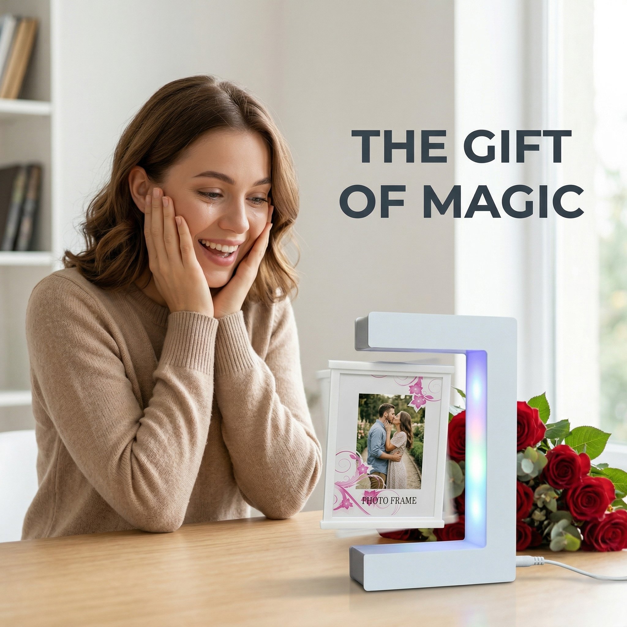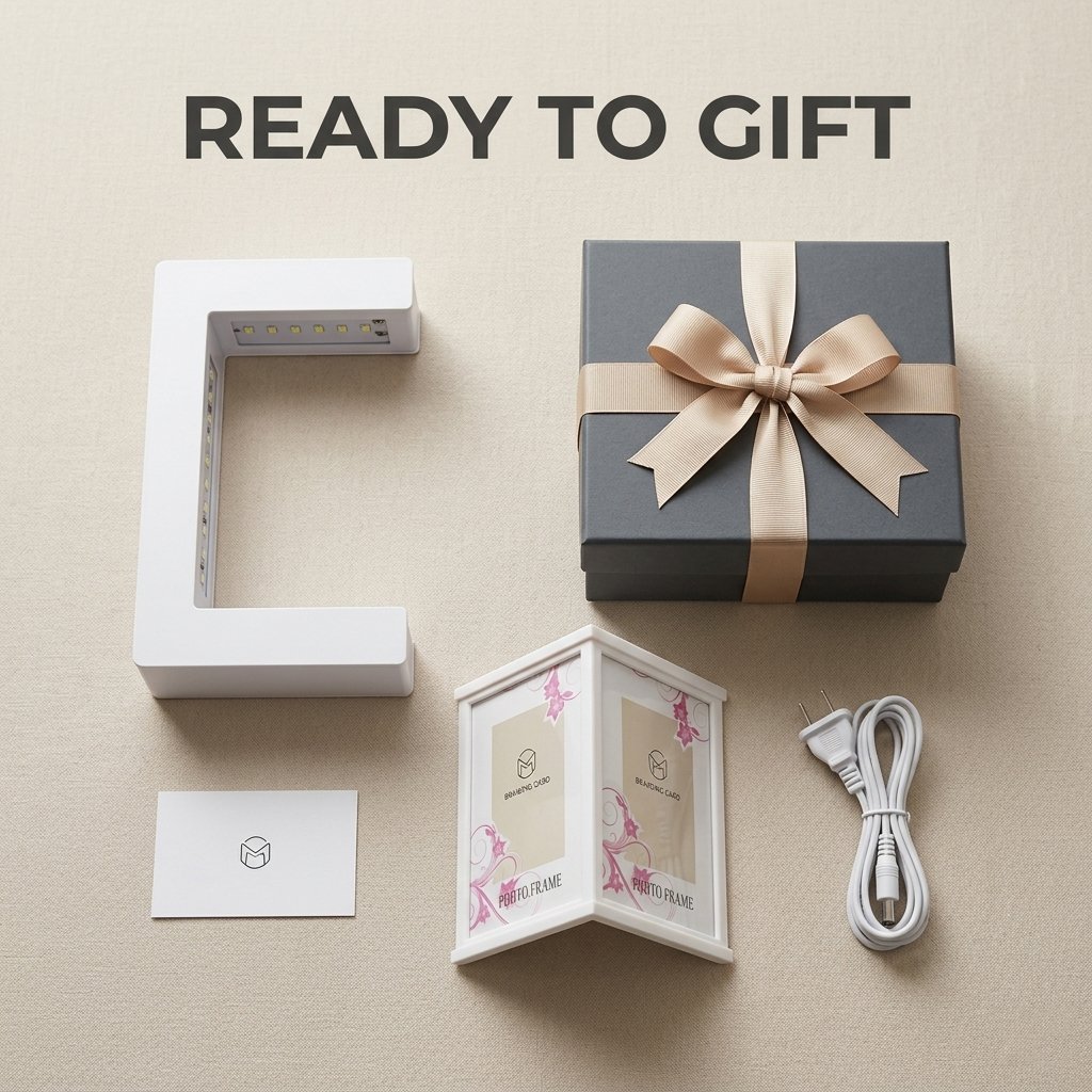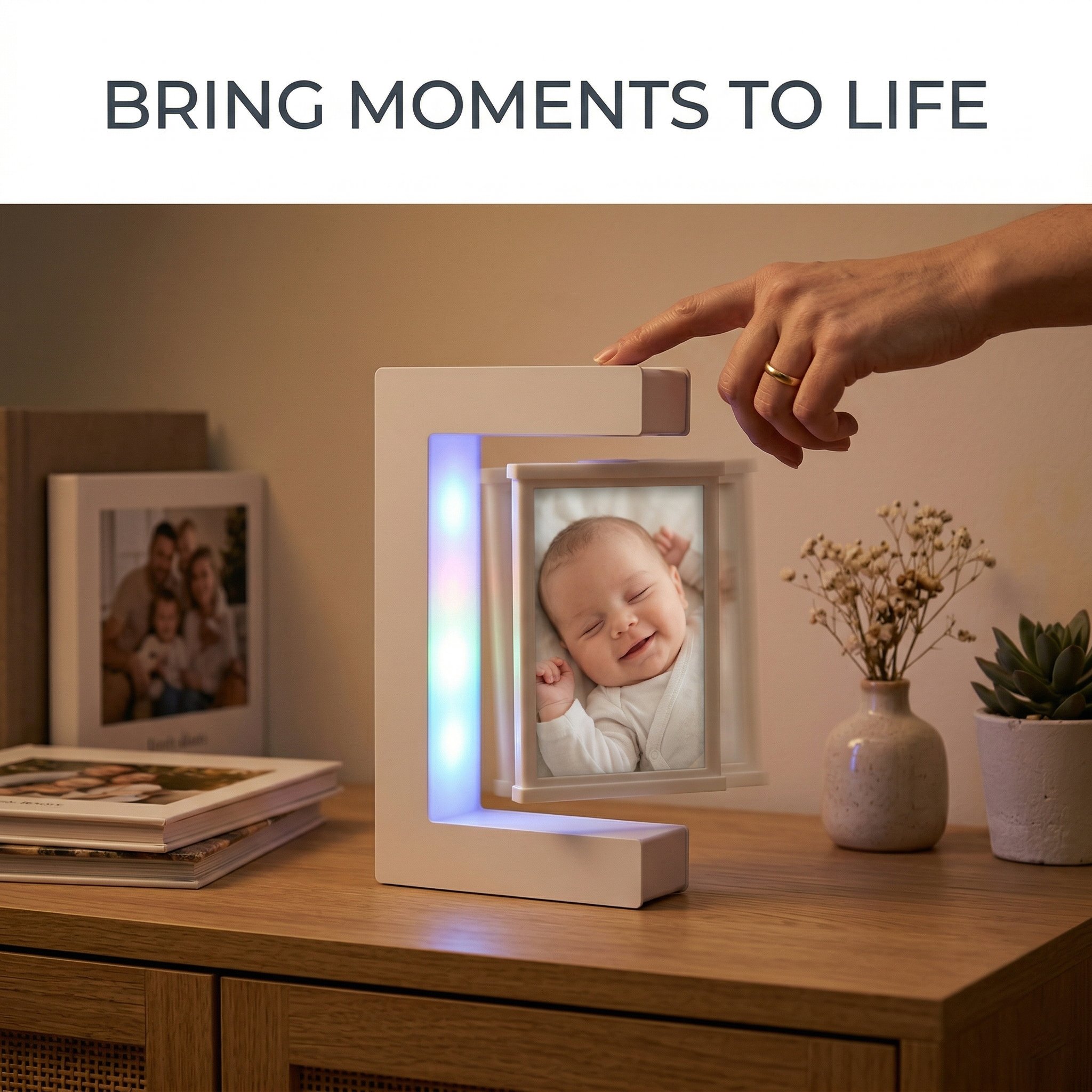 When the sun goes down, the magic continues. The C-shape base features vibrant, built-in LED lights that illuminate your floating photos, instantly turning it into a mesmerizing night light and a relaxing visual centerpiece.